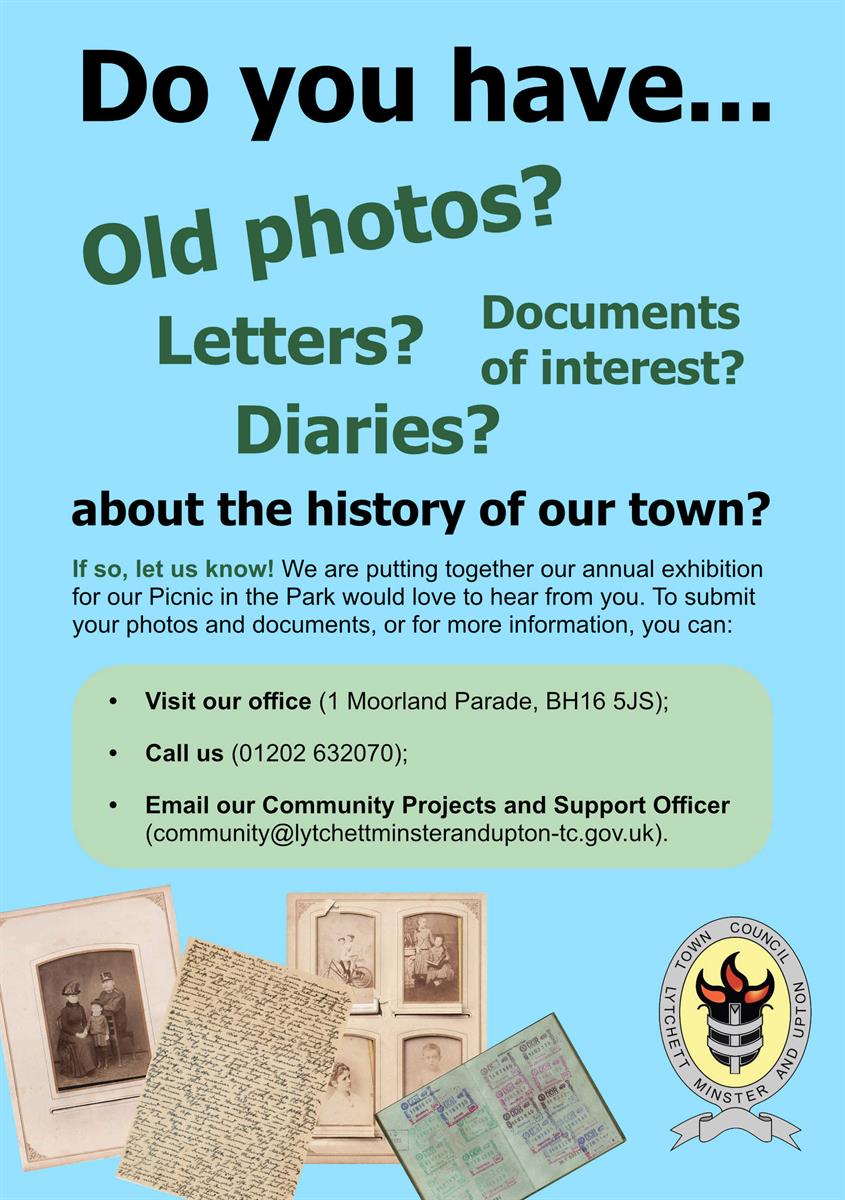 photographs and documents with details from days gone by about Lytchett Minster and Upton. We are putting together an exhibition to celebrate the history of the town in time for our Picnic in the Park (Sat 27th June), so please get in touch with our council if you have anything of interest.